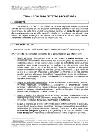 Este documento presenta un resumen del tema 1 del curso de Lengua y Literatura de 2o de Bachillerato impartido en el IES Don Bosco durante el curso 2014-2015. Se define el concepto de texto y se clasifican los textos según diferentes criterios como el canal, la intención comunicativa, el código y el referente. También se describen las modalidades textuales como la narración, descripción, exposición y argumentación. Por último, se explican las propiedades de un texto como la coherencia, cohesión y estructura.