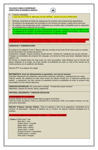 Este documento presenta la información académica semanal para el segundo año básico "A" del Colegio Camilo Henríquez. Incluye el horario de clases, los materiales requeridos, las asignaturas y los contenidos a cubrir durante la semana del 30 de marzo al 2 de abril. También proporciona los horarios de atención de los profesores y detalles sobre las evaluaciones programadas.