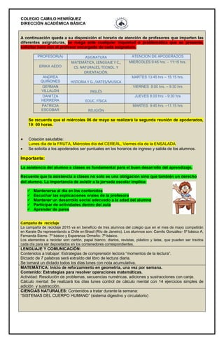 El documento proporciona información sobre los requerimientos y actividades para los estudiantes de segundo año básico "A" de la próxima semana en el Colegio Camilo Henríquez. Destaca que el viernes 8 de mayo se realizará un acto por el Día de la Madre y enumera los requerimientos de vestimenta e información sobre la canción a interpretar. Además, detalla los contenidos académicos que se cubrirán en cada asignatura y las evaluaciones programadas.