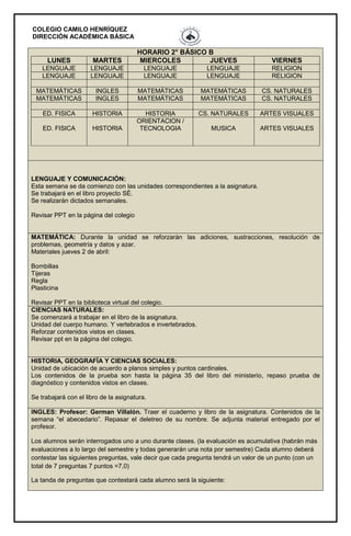 Este documento proporciona información sobre los requerimientos y actividades académicas para los estudiantes de segundo año básico "B" del Colegio Camilo Henríquez para la semana del 30 de marzo al 2 de abril. Algunas actividades incluyen una salida pedagógica al Parque Alhue el martes, pruebas de nivel mensuales, y requerimientos de materiales específicos para las diferentes asignaturas como lenguaje, matemáticas e inglés. El documento también incluye el horario semanal de
