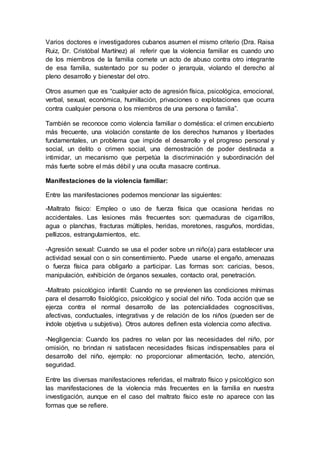 El documento trata sobre la violencia intrafamiliar. Define la violencia intrafamiliar como cualquier acto que menoscaba la integridad física o psicológica de los miembros de la familia. Describe las manifestaciones como el maltrato físico, psicológico y sexual. Explica que la violencia genera más violencia y fractura la estructura familiar de forma irreparable. Las consecuencias de la violencia intrafamiliar incluyen graves daños emocionales y conductuales.