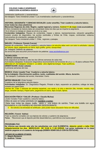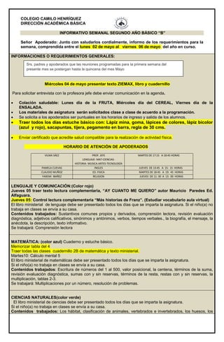 Este documento presenta un informativo semanal para los apoderados del segundo año básico "B" del Colegio Camilo Henríquez. Incluye información sobre los requerimientos y materiales necesarios para la semana del 2 al 6 de mayo, así como los horarios de atención de los profesores. También presenta los contenidos trabajados y por trabajar en cada asignatura.