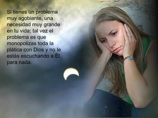 El documento presenta varios principios importantes sobre la oración. Indica que es importante escuchar a Dios en la oración en lugar de hablar sin parar sobre nuestras necesidades. Aconseja permanecer en silencio para escuchar la voz de Dios y recibir impresiones. También señala que la oración no debe consistir en insistir o demandar, sino en entrar en comunión con Dios y esperar con fe Su respuesta divina, aunque a veces Él responde de formas extrañas y en Su debido tiempo.