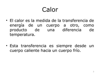 Este documento trata sobre el tema del calor. Explica que el calor es la medida de la transferencia de energía de un cuerpo a otro debido a una diferencia de temperatura, la cual siempre ocurre de un cuerpo caliente a uno más frío. También define la capacidad calórica específica como la capacidad de una sustancia para almacenar energía interna. Por último, explica que en un sistema aislado con sustancias a diferentes temperaturas, el calor se transfiere hasta alcanzar el equilibrio térmico, conservándose la cantidad total de cal