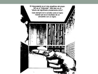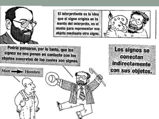 El documento habla sobre la semiótica y los signos. Define la semiótica como el estudio de los objetos que participan en la creación de significados a través de convenciones. Explica las definiciones de signo según Saussure, Peirce y Eco. También describe cómo los sistemas están compuestos de entidades y relaciones, y cómo los individuos se mueven entre sistemas. Finalmente, analiza el campo semántico de diferentes tipos de mobiliario y cómo estos reflejan las actividades humanas como sentarse, descansar, escribir y