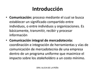 Este documento resume los conceptos clave de la comunicación integral de mercadotecnia. Explica que la CIM implica coordinar e integrar las herramientas de comunicación de una empresa para maximizar el impacto en los stakeholders. Luego describe los objetivos de la CIM como crear conciencia del producto, dar a conocer sus características, generar interés y persuadir al público para inducir la acción de compra. Finalmente, identifica los cinco elementos claves de la CIM como el consumidor, los puntos de contacto, hablar con una sola voz, construir rel