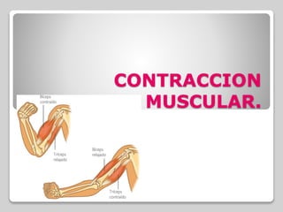 El documento describe la fisiología de la contracción muscular. Explica que los músculos están compuestos de fibras musculares que se contraen gracias a la interacción de las proteínas actina y miosina. La contracción ocurre cuando los impulsos nerviosos causan la liberación de iones de calcio que activan este proceso proteico. Esto libera energía a través de la destrucción de ATP y causa el acortamiento de la fibra muscular.