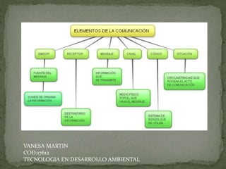 Este documento presenta información sobre Vanesa Martín, estudiante de Tecnología en Desarrollo Ambiental. Explica conceptos clave como comunicación, transmisor, receptor, medios de transmisión y problemas en la comunicación. También cubre temas como las nuevas tecnologías de la información y la comunicación y reglas de ortografía.