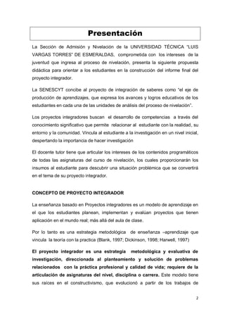 Este documento presenta los pasos para elaborar el informe final del proyecto integrador para estudiantes de la Universidad Técnica "Luis Vargas Torres" de Esmeraldas. Explica que el proyecto integrador busca desarrollar competencias a través de la investigación y la vinculación de los estudiantes con su entorno. Detalla los elementos que debe contener el informe final como la portada, índice, introducción, marco teórico, metodología y conclusiones. Asimismo, provee una guía para la elaboración del proyecto
