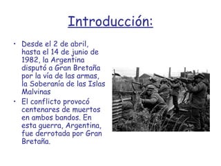 El documento resume el conflicto entre Argentina y Gran Bretaña por las Islas Malvinas que ocurrió entre el 2 de abril y el 14 de junio de 1982. Los soldados argentinos no estaban preparados para la guerra y sufrieron malas condiciones. Finalmente, Argentina se rindió y la guerra dejó más de 700 soldados argentinos muertos. El documento concluye expresando el deseo continuo de Argentina de recuperar las Islas Malvinas.