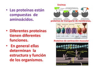El documento describe el proceso por el cual la información genética en el ADN se utiliza para producir proteínas. El código genético en el ADN se transcribe en ARNm en el núcleo y luego el ARNm se traduce en proteínas en los ribosomas del citoplasma a través de la unión de aminoácidos guiados por los codones en el ARNm. Este proceso universal garantiza que los mismos codones representen los mismos aminoácidos en todos los organismos.