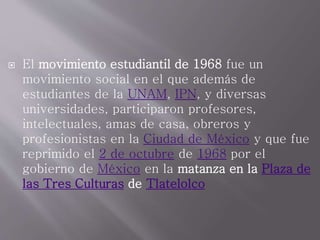 El movimiento estudiantil de 1968 en México involucró a estudiantes, profesores, amas de casa y obreros que protestaron contra el gobierno. El 2 de octubre de 1968, el gobierno reprimió las protestas en la Plaza de las Tres Culturas de Tlatelolco mediante el uso del Batallón Olimpia y el ejército mexicano, resultando en la muerte de cientos de civiles. El Batallón Olimpia era un grupo paramilitar creado para los Juegos Olímpicos de 1968 pero que fue utilizado para infiltrarse