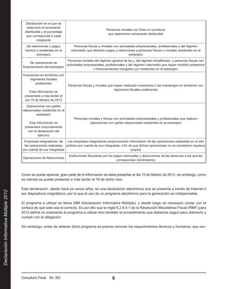 Este documento describe el procedimiento para obtener e instalar el programa DIM (Declaración Informativa Múltiple) requerido para presentar la declaración informativa múltiple de 2012 ante el Servicio de Administración Tributaria de México. Explica primero quiénes están obligados a presentar cada tipo de información, luego detalla los requisitos técnicos necesarios y finalmente los pasos a seguir para descargar e instalar correctamente el programa, capturar la información requerida y presentar la declaración.