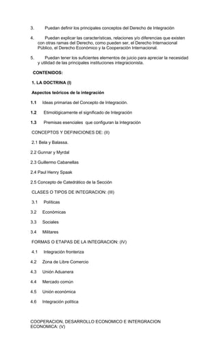 Este documento presenta el plan de estudios para la asignatura de Derecho de Integración. El curso introduce conceptos clave del Derecho de Integración y examina varias organizaciones e instituciones regionales e internacionales involucradas en la integración económica y política. El programa de estudios también describe los objetivos del curso, contenidos, metodología y evaluación.