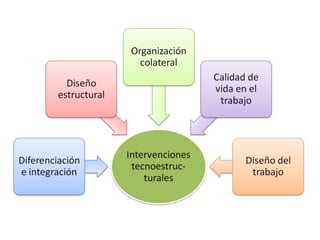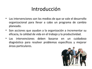 Este documento describe diferentes tipos de intervenciones en procesos humanos utilizados en el desarrollo organizacional. Brevemente describe cinco intervenciones principales: 1) Grupos T, 2) Consultoría de procesos, 3) Intervención de tercera parte, 4) Formación de equipos, y 5) Encuestas de retroalimentación. El objetivo general de estas intervenciones es mejorar la efectividad de la organización mediante el desarrollo de procesos, habilidades y dinámicas de grupos entre el personal.