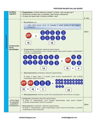 El documento describe una actividad de aprendizaje para estudiantes de segundo grado sobre descomponer y componer números utilizando chapas y tapas. Los estudiantes jugarán a canjear números representados con chapas y tapas de diferentes colores para practicar descomponer y componer cantidades. Luego practicarán ejercicios adicionales descomponiendo y componiendo números usando las chapas y tapas.