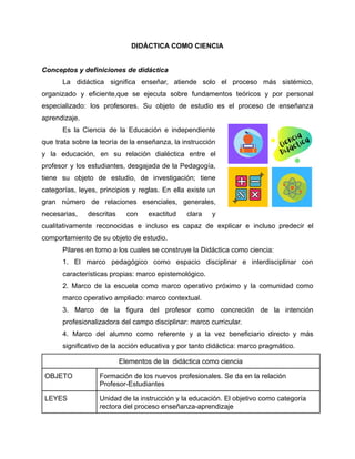 La didáctica es la ciencia de la enseñanza y el aprendizaje. Tiene como objeto de estudio el proceso de enseñanza-aprendizaje y se construye sobre pilares como el marco pedagógico, la escuela, el profesor y el alumno. La didáctica estudia elementos como el objeto, las leyes, los principios, las reglas y las categorías del proceso de enseñanza. Este proceso es bilateral, intencional, regulado, multifacético y dialéctico. La didáctica busca consolidar un