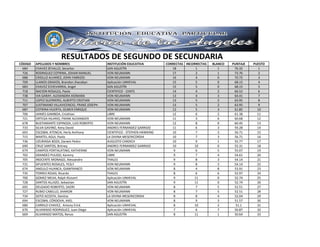 El documento presenta los resultados de un examen de 73 estudiantes de segundo año de secundaria. Incluye el código, nombre, institución educativa, número de respuestas correctas, incorrectas y en blanco de cada estudiante y su puntaje y puesto final. Carlos Chavez Zevallo de la institución San Agustín obtuvo el primer puesto con mayor puntaje.