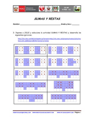 El documento proporciona instrucciones para que los estudiantes completen una actividad en línea de sumas y restas en JCLIC. Les pide a los estudiantes que ingresen a JCLIC, seleccionen la actividad de "Sumas y Restas" y completen los ejercicios provistos en la dirección URL dada.