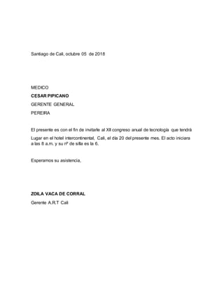 Zoila Vaca de Corral, gerente de A.R.T Cali, envió 27 invitaciones al XII Congreso Anual de Tecnología que se llevará a cabo el 20 de octubre en el Hotel Intercontinental de Cali. Cada invitación asigna un número de silla a los profesionales invitados de diferentes áreas como ingeniería, medicina, administración, entre otros.