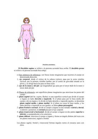 El documento describe los conceptos básicos de la anatomía, incluyendo las posiciones y planos de referencia, y los términos utilizados para describir la localización de las estructuras anatómicas. Explica la posición anatómica estándar, los tres planos principales (sagital, frontal y transversal), y proporciona varios ejemplos de términos como axial, craneal, proximal y medial que especifican la ubicación relativa de las partes del cuerpo.