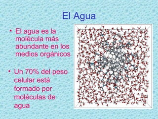 El documento describe las propiedades del agua. El agua es la molécula más abundante en los organismos vivos y constituye alrededor del 70% del peso celular. Está formada por dos átomos de hidrógeno y uno de oxígeno. Las moléculas de agua se unen mediante enlaces de hidrógeno, lo que le da propiedades únicas como su capacidad de disolución y su comportamiento anómalo al cambiar de estado. El agua es esencial para los procesos químicos y la regulación de temper