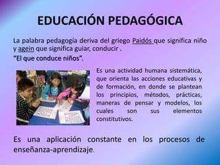 El documento presenta información sobre el proceso y diseño curricular. Explica que la pedagogía se refiere a guiar a los niños y que el currículo incluye objetivos, contenidos, métodos y evaluaciones. También describe las teorías del currículo centradas en el niño, la sociedad y el conocimiento lógico. Finalmente, menciona a José Gimeno Sacristán y sus cinco perspectivas sobre el diseño curricular.