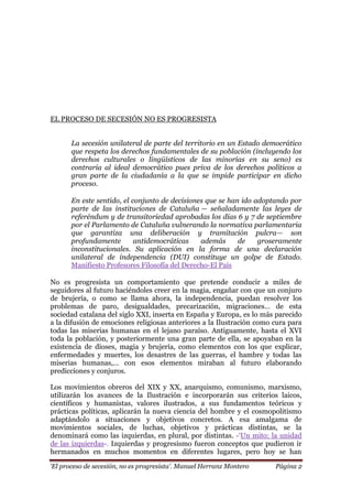 El documento critica el proceso de secesión en Cataluña, argumentando que no es progresista. Señala que priva de derechos políticos a parte de la ciudadanía y va en contra de los ideales democráticos. También sugiere que abandonar el racionalismo para apoyar al nacionalismo es contrario a los valores ilustrados de la izquierda. Concluye diciendo que el proceso independentista bucea en un nacionalismo excluyente y es un retroceso anti-ilustrado.