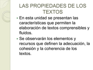 Este documento presenta una introducción al curso de discurso científico. Explica las propiedades que deben tener los textos para ser comprensibles, como la adecuación, coherencia y cohesión. Describe que la coherencia se refiere a la organización global de las ideas en el texto, mientras que la cohesión se refiere a los mecanismos lingüísticos que conectan las oraciones y párrafos. Finalmente, da ejemplos de cómo lograr la cohesión a través de la repetición, sustitución y elipsis