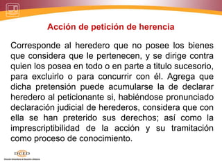 Este documento trata sobre varios temas relacionados con el derecho de sucesiones en el Perú, incluyendo la acción de petición de herencia, la acción reivindicatoria de herencia, la indignidad, la desheredación y la aceptación de la herencia. Explica las características y requisitos de cada una de estas figuras legales en el contexto de las sucesiones testamentarias e intestadas.