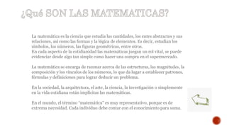 Este documento describe brevemente la matemática como la ciencia que estudia las cantidades, los entes abstractos y sus relaciones. Explica que las matemáticas juegan un papel vital en la vida cotidiana y están implícitas en muchos aspectos de la sociedad como la arquitectura, el arte, la ciencia y la investigación. Además, señala que las matemáticas son extremadamente necesarias y que cada individuo debe tener conocimiento básico de suma.
