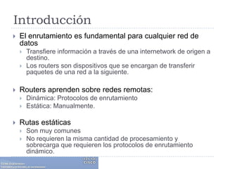 Este documento describe el enrutamiento estático y sus características. El enrutamiento estático implica configurar manualmente las rutas en los routers en lugar de usar protocolos de enrutamiento dinámicos. Las rutas estáticas son comunes y requieren menos procesamiento que los protocolos dinámicos. Los routers aprenden sobre redes remotas de forma dinámica a través de protocolos o de forma estática configurándolas manualmente.