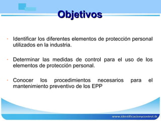 Este documento describe los diferentes elementos de protección personal utilizados en la industria, incluyendo cascos, gafas, tapabocas, guantes, botas y ropa protectora. Explica los objetivos de cada elemento, cómo seleccionarlos en base al riesgo, su clasificación, normativas, uso adecuado y mantenimiento para garantizar su efectividad.