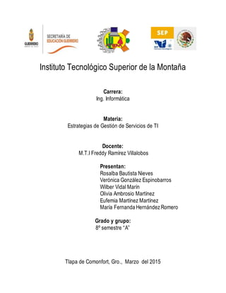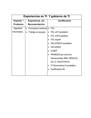 El documento presenta las experiencias y recomendaciones de un experto en ingeniería informática que incluyen la formación continua, el trabajo en equipo y certificaciones en ITIL, ISO 27000, ISO 20000, COBIT, PRINCE2 e IBM, ORACLE, CA y EASYVISTA, así como en Gobernanza de TI.