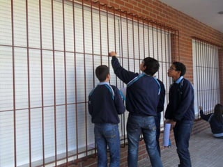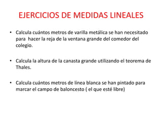 Este documento presenta varios ejercicios prácticos de geometría que involucran medidas lineales y cálculos de áreas. Los estudiantes deben calcular la cantidad de materiales necesarios para proyectos como una reja, una canasta de baloncesto y pintura para columnas; y estimar el área lateral de un edificio escolar. También se pide crear un problema adicional sobre áreas para los compañeros que involucre objetos del recreo.