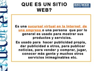 Este documento describe los elementos fundamentales para crear un sitio web exitoso, incluyendo dominio, hosting, contenido y análisis. Explica que un dominio es el nombre de una empresa en Internet y que el hosting provee alojamiento web. Además, destaca la importancia de crear contenido atractivo y de medir las métricas del sitio como visitas y duración para analizar su rendimiento.