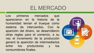 El documento proporciona una introducción al concepto de mercado, describiendo a compradores, vendedores y la investigación de mercado. Explica que la investigación de mercado comprende cuatro aspectos esenciales y analiza diferentes tipos de mercados, clientes, competencia y segmentación de mercado. Resalta la importancia de entender a los clientes y la competencia para tener éxito en un emprendimiento.