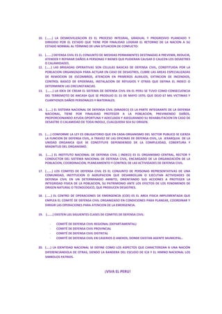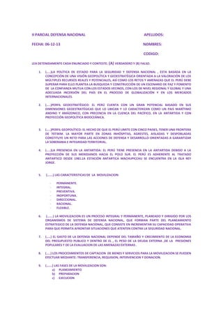 Este documento contiene 20 enunciados sobre la política de defensa nacional y seguridad del Perú, su perfil geoestratégico y geopolítico, la presencia del país en la Antártida, las características y fases de la movilización, el gasto en defensa nacional, los procedimientos de captación de bienes y servicios para la movilización, las funciones del Sistema Nacional de Defensa Civil y el Instituto Nacional de Defensa Civil, y los diferentes comités de defensa civil. También define la identidad nacional peruana a
