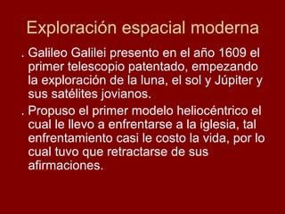 El documento describe la historia de la exploración espacial, desde los primeros telescopios de Galileo hasta las misiones espaciales modernas. Explica la evolución de los telescopios ópticos y los principales tipos como reflectores, refractores y cassegrain. También describe importantes sondas espaciales como Voyager 1, Cassini-Huygens y New Horizons, así como los cohetes de lanzamiento y las dos únicas estaciones espaciales tripuladas actualmente en órbita, la Estación Espacial Internacional y la Est