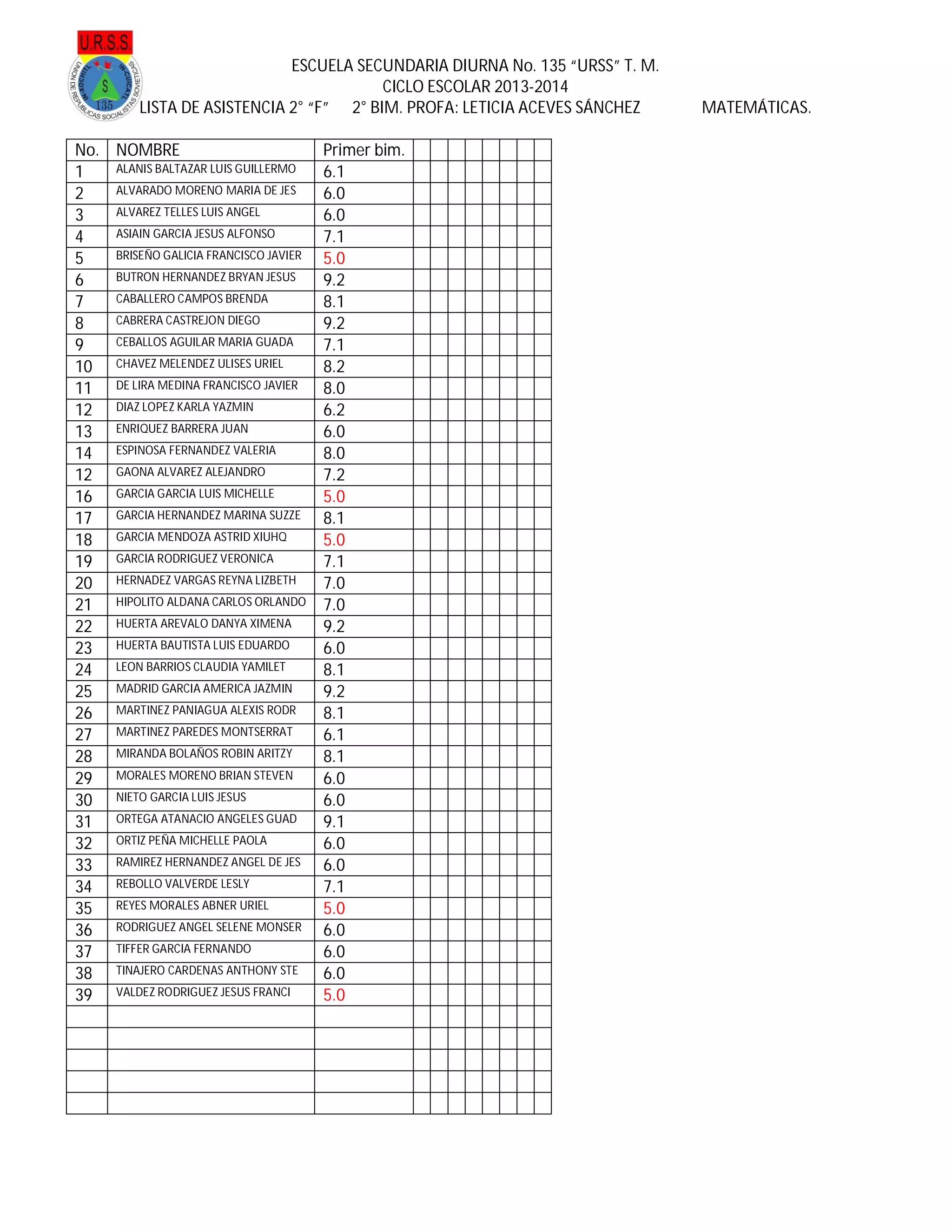 Este documento presenta la lista de asistencia de la clase 2° "F" del segundo bimestre en la Escuela Secundaria Diurna No. 135 "URSS". Contiene los nombres de 39 estudiantes y sus calificaciones del primer bimestre en la asignatura de Matemáticas.