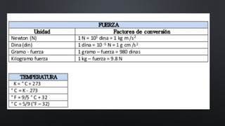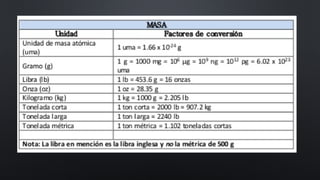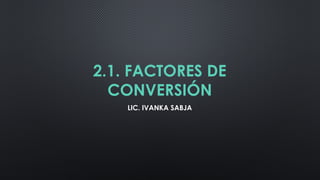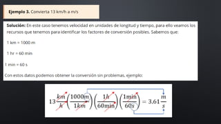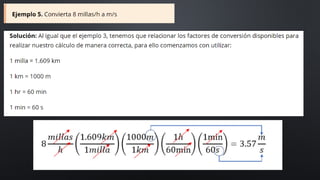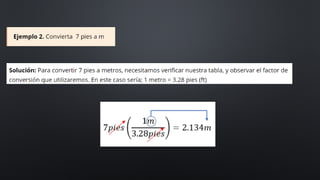 El documento explica el concepto de factor de conversión, que permite expresar una cantidad en diferentes unidades de medida. Se presentan un procedimiento para realizar conversiones y ejemplos prácticos que incluyen conversiones de millas a metros, pies a metros, y galones a litros. También se aborda la importancia de realizar conversiones en el comercio internacional.
