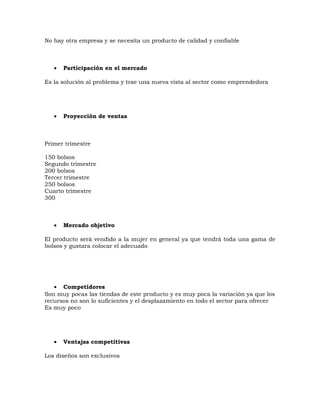 Este documento presenta un plan de negocios para una empresa llamada Diseños y Productos Villa PA que fabricará bolsos para damas en sintético y cuero. El propietario es Elías David Villamizar Pacheco y la empresa se ubicará en Bogotá. El plan analiza el mercado objetivo, la competencia, proyecciones de ventas y costos de producción. Explica que la empresa satisfará una necesidad en el mercado ofreciendo bolsos de calidad a precios competitivos mediante estrategias de promoción y distribución. Detalla los pro