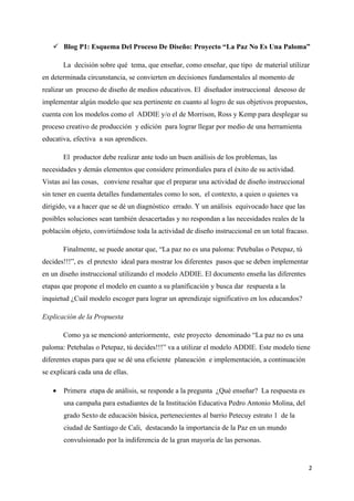 Este documento presenta una propuesta de diseño instruccional para un proyecto educativo llamado "La paz no es una paloma: Petebalas o Petepaz, tú decides!!!". El proyecto utilizará el modelo ADDIE de cinco fases (análisis, diseño, desarrollo, implementación y evaluación) para crear materiales educativos. El proyecto se enfocará en estudiantes de sexto grado de una escuela en Cali, Colombia y promoverá valores como la tolerancia y el diálogo pacífico. El documento explica
