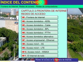 El documento ofrece una introducción al campo de las redes de computadoras, abarcando principios y tecnologías actuales y futuras. Detalla los diferentes tipos de acceso a Internet, incluyendo ADSL, cable, BPL y fibra óptica hasta el hogar (FTTH), así como modelos de red como cliente/servidor y peer-to-peer. También se exploran las características de redes para acceso doméstico y empresarial, incluida la conectividad móvil a través de redes 3G.