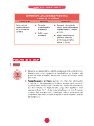 En esta sesión, los estudiantes aprenderán a estimar el tiempo y expresarlo en días, semanas y horas usando recursos como el calendario. Resolverán problemas que implican estimar el tiempo entre dos fechas. Organizados en grupos, estimarán primero y luego usarán el calendario para verificar cuántas semanas han pasado y días faltan entre el inicio y fin de la elaboración de cometas. Revisarán su estimación inicial.