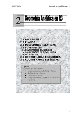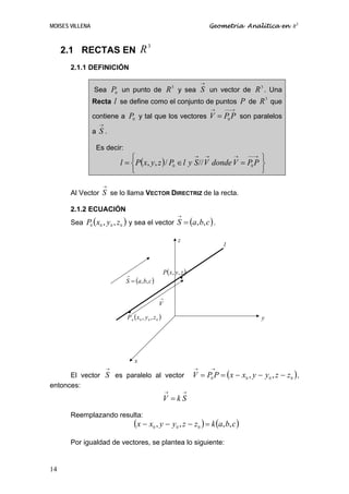 Este documento describe las rectas en R3, incluyendo su definición, ecuaciones y representaciones paramétricas. Explica que una recta se define por un punto y un vector director paralelo, y proporciona las fórmulas para encontrar las ecuaciones de una recta dados estos elementos o dados dos puntos. También incluye ejemplos y ejercicios para que el estudiante practique encontrar ecuaciones de rectas en R3.