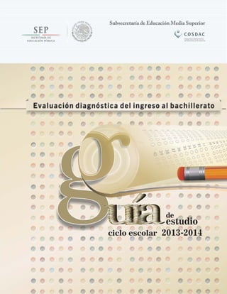 Este documento presenta una guía de estudio para la evaluación diagnóstica de ingreso al bachillerato en habilidades matemáticas y lectoras. La guía incluye ejemplos y ejercicios de diferentes temas matemáticos y de lectura, así como las claves de respuesta. El propósito es que los estudiantes identifiquen sus áreas de oportunidad y las refuercen antes de ingresar al nivel medio superior.