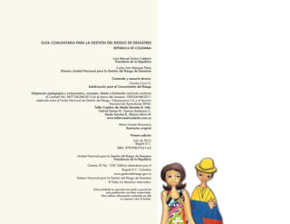 Este documento presenta una guía comunitaria para la gestión del riesgo de desastres en Colombia. Explica que la guía está dirigida a comunidades y organizaciones sociales para que asuman responsabilidad en la gestión del riesgo en sus territorios. La guía busca mejorar la percepción, corresponsabilidad y participación ciudadana frente al riesgo, que son pilares fundamentales para articular normas y cultura en la reducción de desastres.