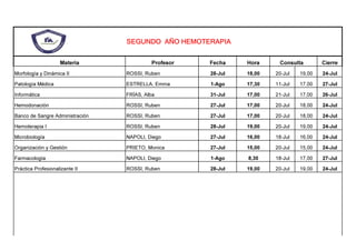 El documento presenta el cronograma de consultas y cierres de materias del segundo año de Hemoterapia. Se detallan 11 materias con sus respectivos profesores, fechas, horas de consulta y cierre. La mayoría de las consultas y cierres son durante la última semana de julio, aunque algunas continúan hasta la primera semana de agosto.
