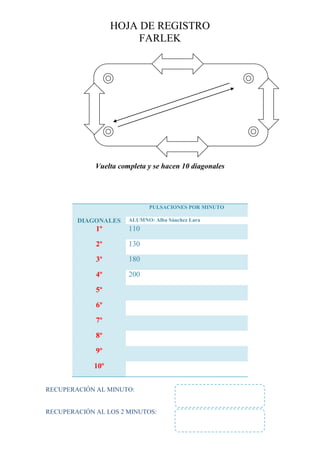 La hoja de registro muestra las pulsaciones por minuto de Alba Sánchez Lara durante un entrenamiento de farlek que consistió en una vuelta completa más 10 diagonales. Sus pulsaciones aumentaron progresivamente con cada diagonal, desde 110 pulsaciones por minuto en la primera hasta 200 en la cuarta, y luego se recuperó a un ritmo normal en los minutos siguientes al ejercicio.